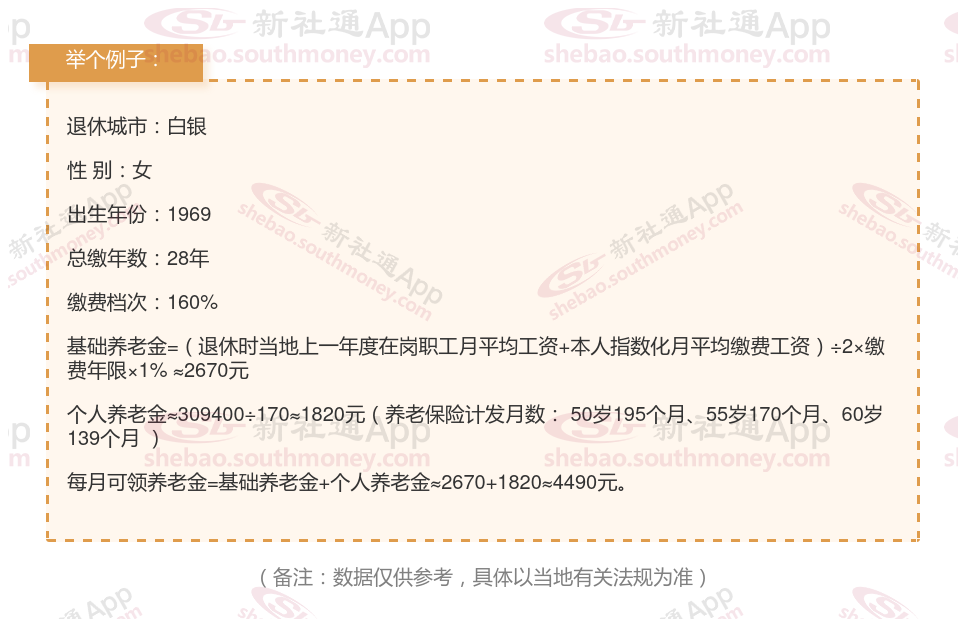 退休城市:白银,性别:女,出生年份:1969,总缴年数28年,缴费档次:160%,新社通app养老金计算器所得: