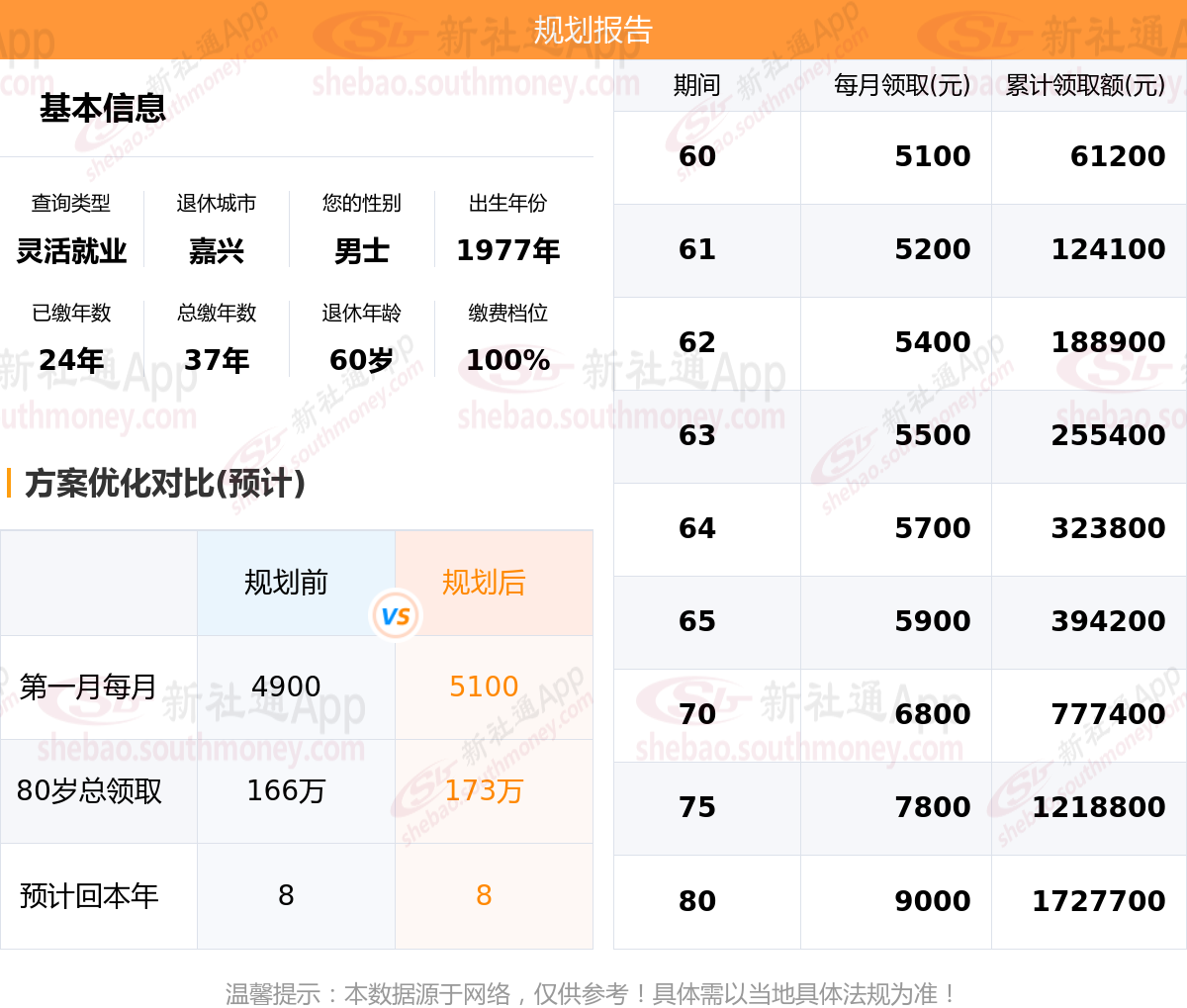 规划前:60岁第一个月约领4900元,新社通APP-养老金规划后:60岁第一个月约领5100元