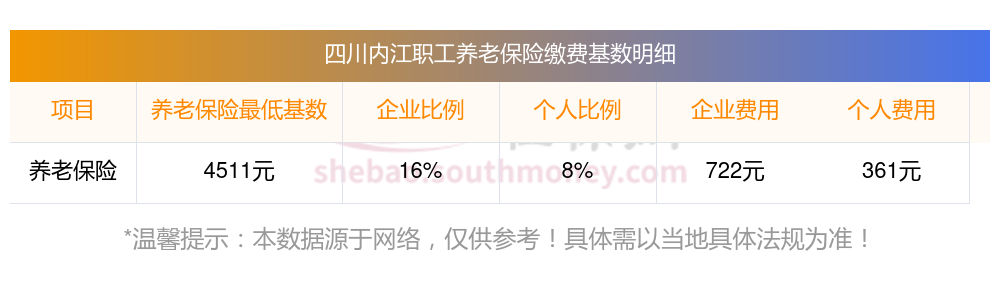 据新社通app获悉,养老保险是为居民退休后的经济来源提供保证的保险,对于单位职工而言,由用人单位和职工本人共同缴纳养老保险,保费较高;而居民的养老保险保费是由居民个人承担。不管是职工养老保险还是居民养老保险,保费都需要通过养老保险缴费基数计算得出。下面随新社通app小编一起来看看四川内江养老金缴费标准2023-2024最新基数比例是多少!