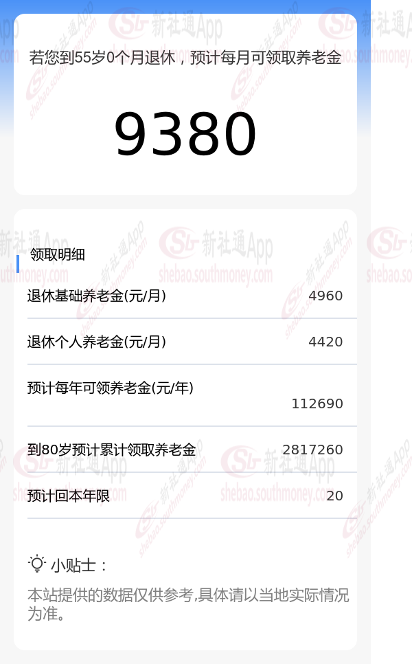 每月总共能领多少:把上面两个数加在一起,就是每个月你能领到的养老金总数啦,大概是9380元(即4960元基础养老金+4420元个人养老金)。