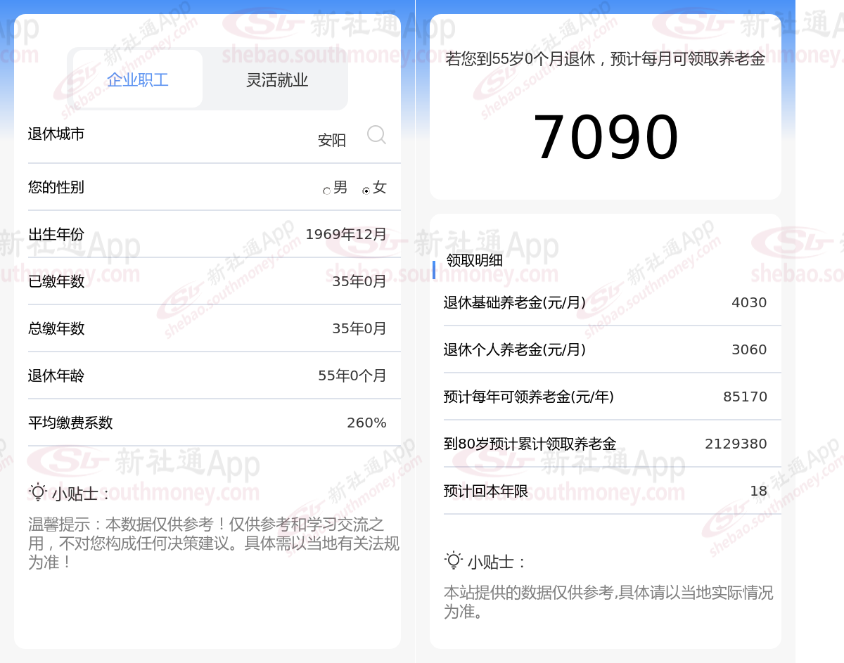 退休城市:安阳,性别:女,出生年份:1969,总缴年数35年,缴费档次:260%,新社通app养老金计算器所得: