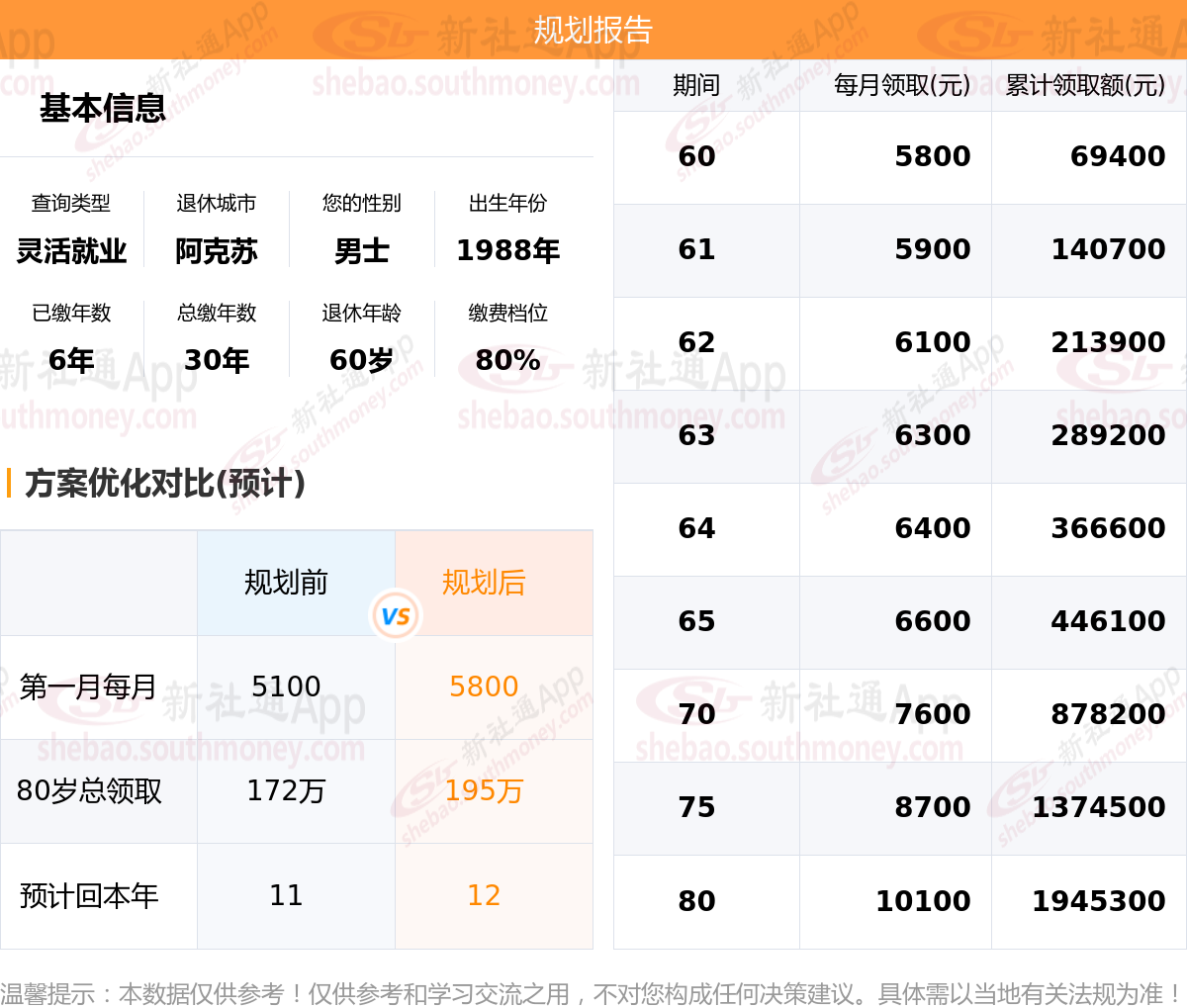 规划前:60岁第一个月约领5100元,新社通APP-养老金规划后:60岁第一个月约领5800元