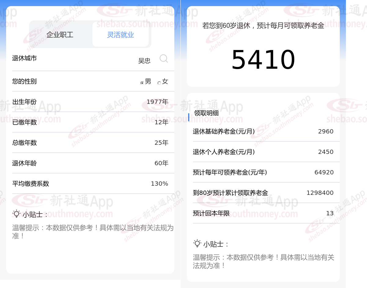 通过新社通APP-养老金计算所得:退休城市、出生年份、退休年龄、缴费系数都相同的情况下,社保缴费年限累计25年时,计算如下: