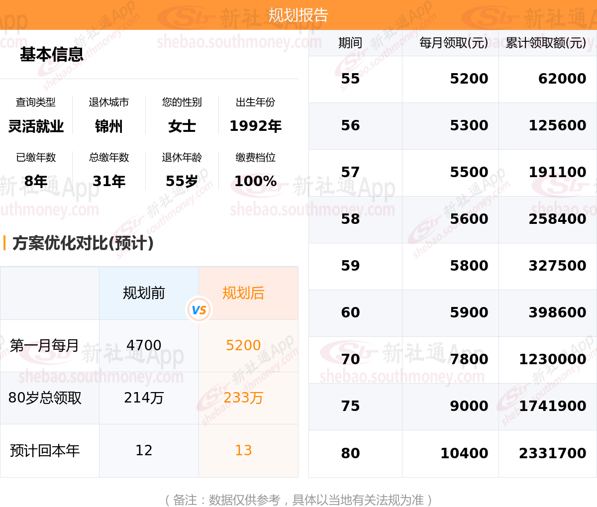 规划前:参保城市:辽宁锦州,性别:女士,出生年月:1992,已缴年限:8年,总缴年数:31年,退休年龄:55岁,缴费档位:100%。