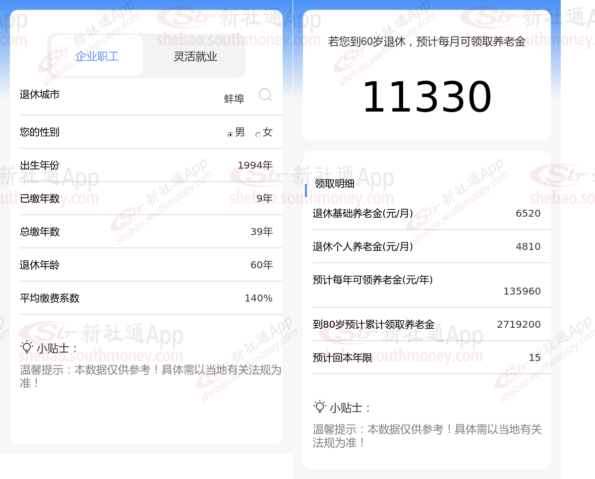 通过新社通APP-养老金计算所得:在保持退休城市、出生年份、退休年龄以及缴费系数这些条件不变的前提下,当个人的社保缴费年限累积达到39年时,其相关计算方式如下: