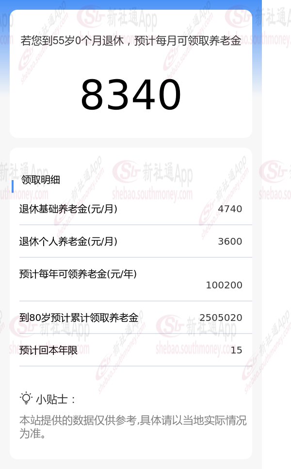 每月可领养老金总额:将基础养老金与个人养老金相加,每月可领取的养老金总额约为8340元(4740元+3600元)。