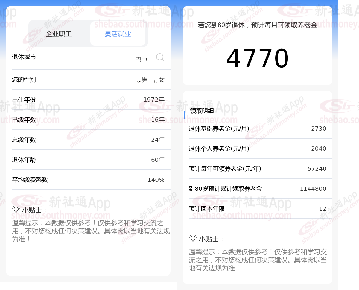 通过新社通APP-养老金计算所得:退休城市、出生年份、退休年龄、缴费系数都相同的情况下,社保缴费年限累计24年时,计算如下: