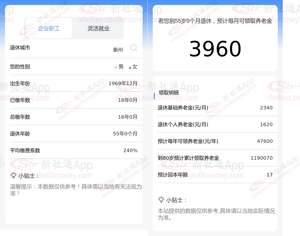 让我们为林某,一位1969年出生的女性退休者,在泰州的养老保险及预计养老金情况进行说明: