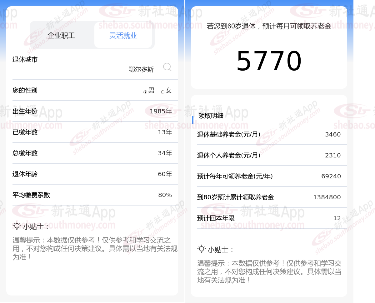 通过新社通APP-养老金计算所得:退休城市、出生年份、退休年龄、缴费系数都相同的情况下,社保缴费年限累计34年时,计算如下:
