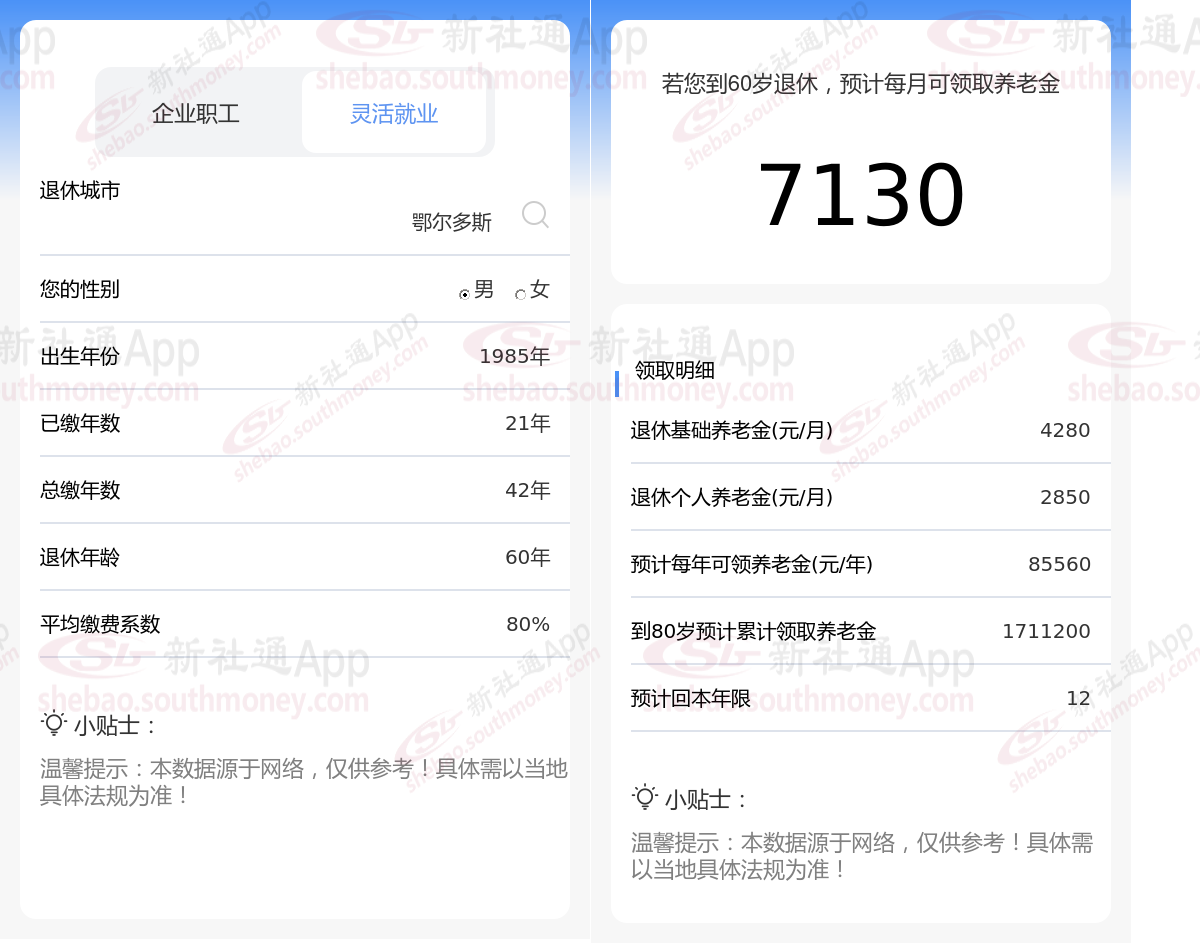 通过新社通APP-养老金计算所得:退休城市、出生年份、退休年龄、缴费系数都相同的情况下,社保缴费年限累计42年时,计算如下: