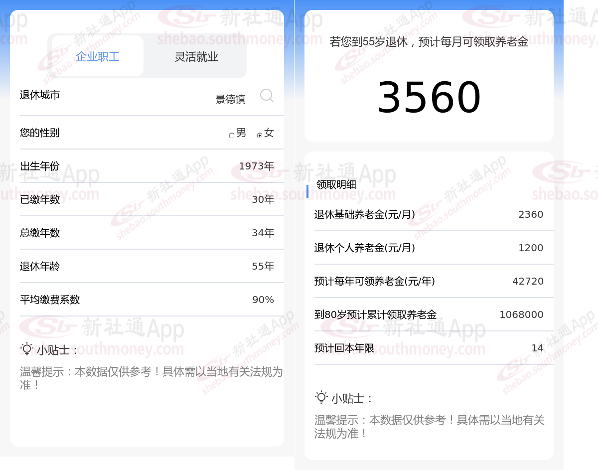 通过新社通APP-养老金计算所得:在保持退休城市、出生年份、退休年龄以及缴费系数这些条件不变的前提下,当个人的社保缴费年限累积达到30年时,其相关计算方式如下: