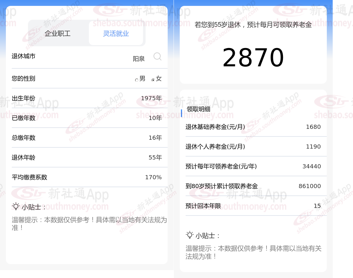 通过新社通APP-养老金计算所得:假设都在阳泉退休、出生年份、退休年龄和缴费系数均保持不变的情况下,若个人的社保缴费年限累计达到16年,那么其相关计算方式如下: