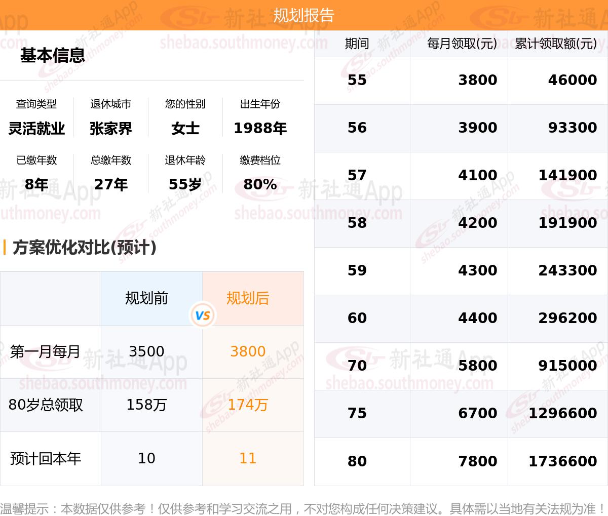 规划前:参保城市:湖南张家界,性别:女士,出生年月:1988,已缴年限:8年,总缴年数:27年,退休年龄:55岁,缴费档位:80%。