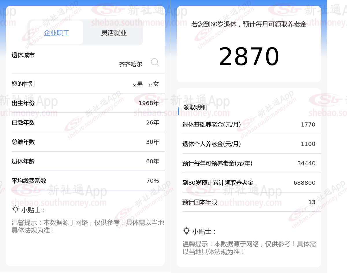 通过新社通APP-养老金计算所得:在保持退休城市、出生年份、退休年龄以及缴费系数这些条件不变的前提下,当个人的社保缴费年限累积达到30年时,其相关计算方式如下: