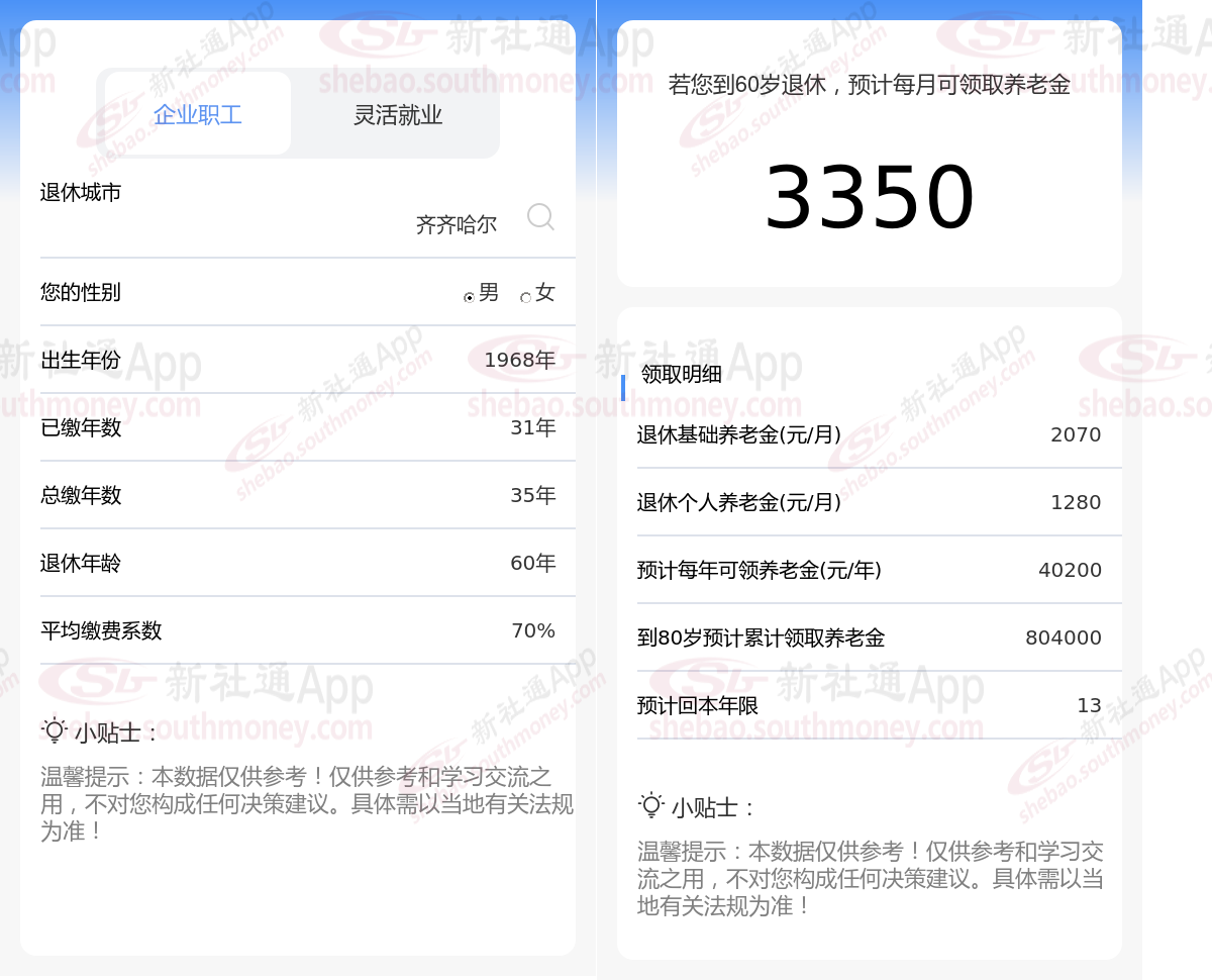 通过新社通APP-养老金计算所得:在保持退休城市、出生年份、退休年龄以及缴费系数这些条件不变的前提下,当个人的社保缴费年限累积达到35年时,其相关计算方式如下: