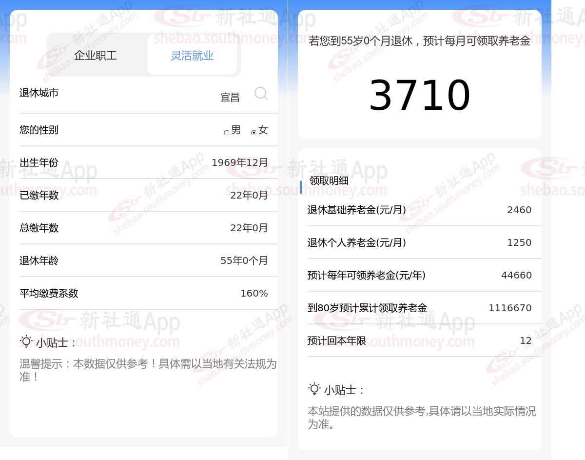 邻居秦某退休城市在宜昌,性别:女,出生年份:1969,总缴年数22年,缴费档次:160%,新社通app养老金计算器所得:
