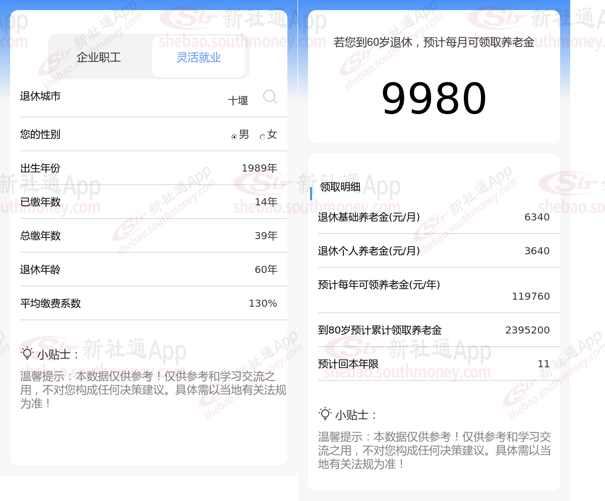 通过新社通APP-养老金计算所得:在保持退休城市、出生年份、退休年龄以及缴费系数这些条件不变的前提下,当个人的社保缴费年限累积达到39年时,其相关计算方式如下: