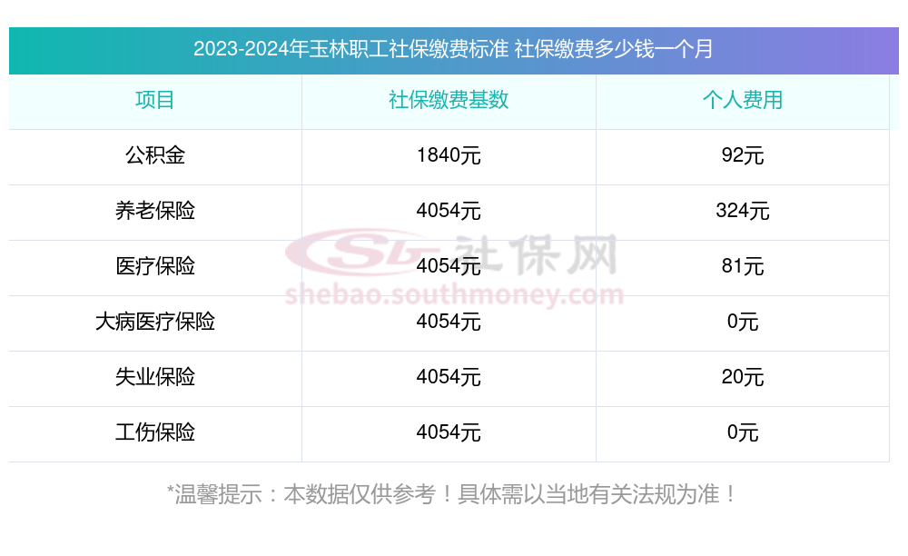 2024年玉林社保缴费多少钱?下表是2023-2024年玉林社保费用明细参考,新社通app-社保缴费查询工具提供的最新数据如下: