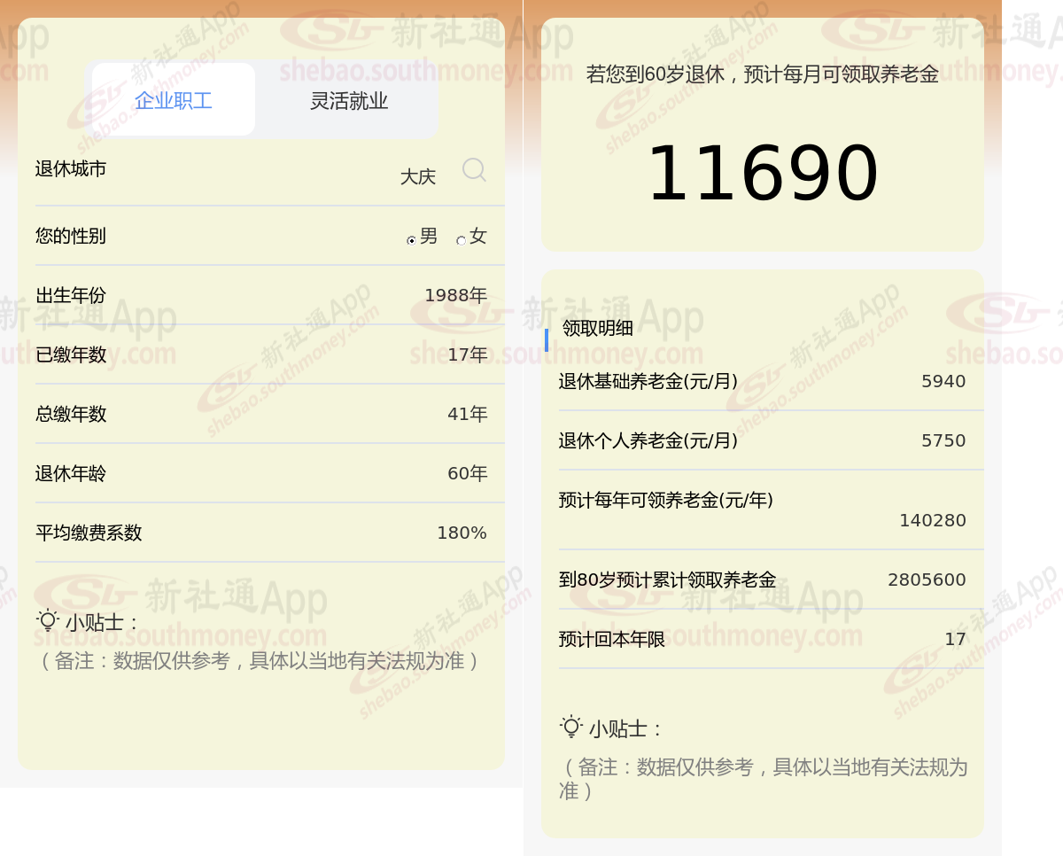 通过新社通APP-养老金计算所得:在保持退休城市、出生年份、退休年龄以及缴费系数这些条件不变的前提下,当个人的社保缴费年限累积达到41年时,其相关计算方式如下: