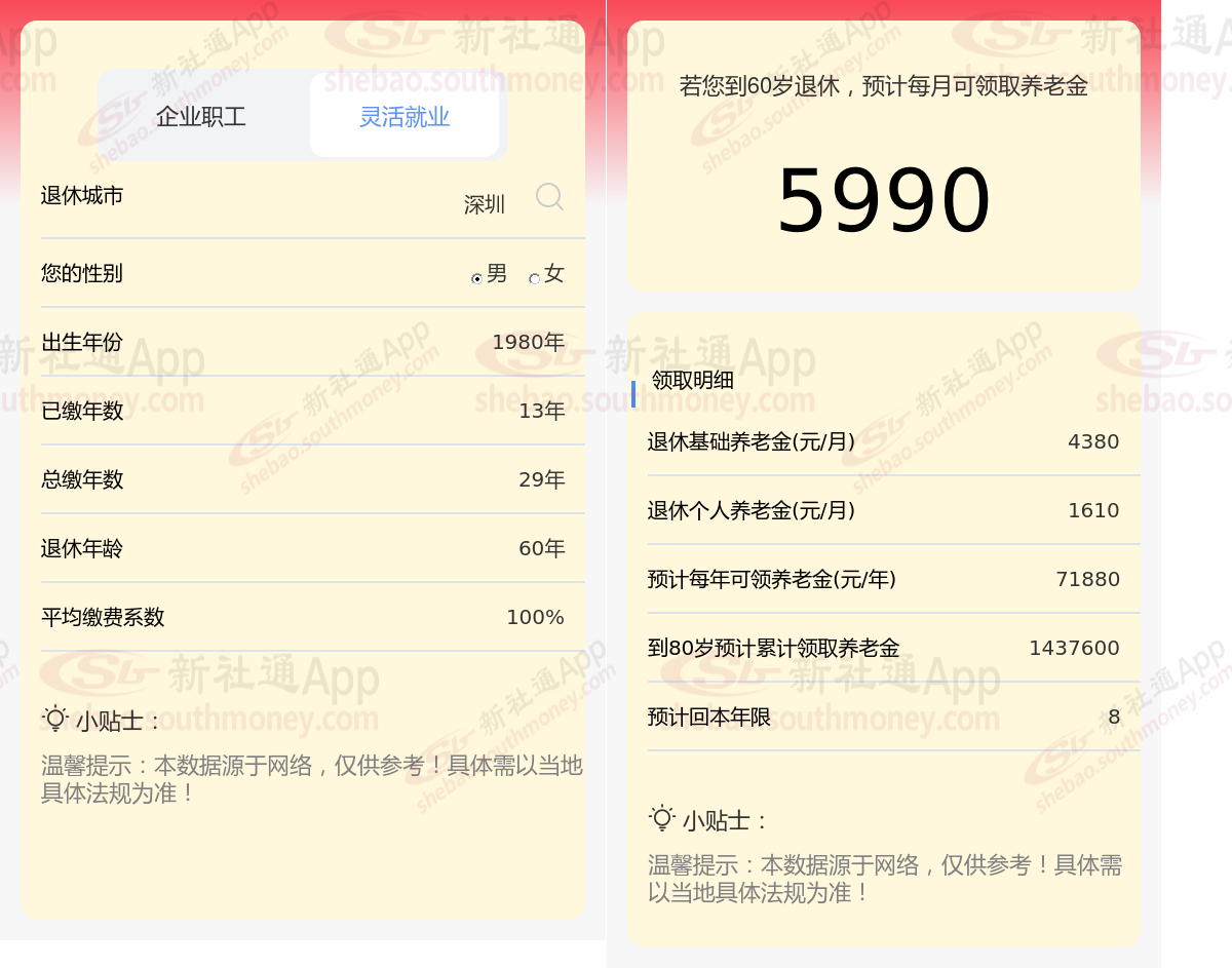 通过新社通APP-养老金计算所得:退休城市、出生年份、退休年龄、缴费系数都相同的情况下,社保缴费年限累计30年时,计算如下: