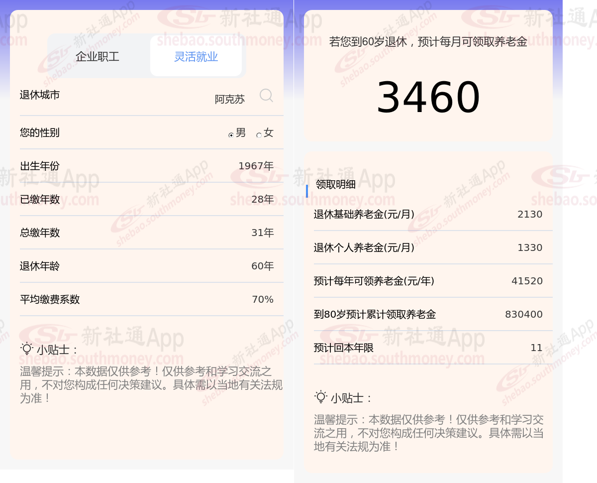 通过新社通APP-养老金计算所得:在保持退休城市、出生年份、退休年龄以及缴费系数这些条件不变的前提下,当个人的社保缴费年限累积达到31年时,其相关计算方式如下: