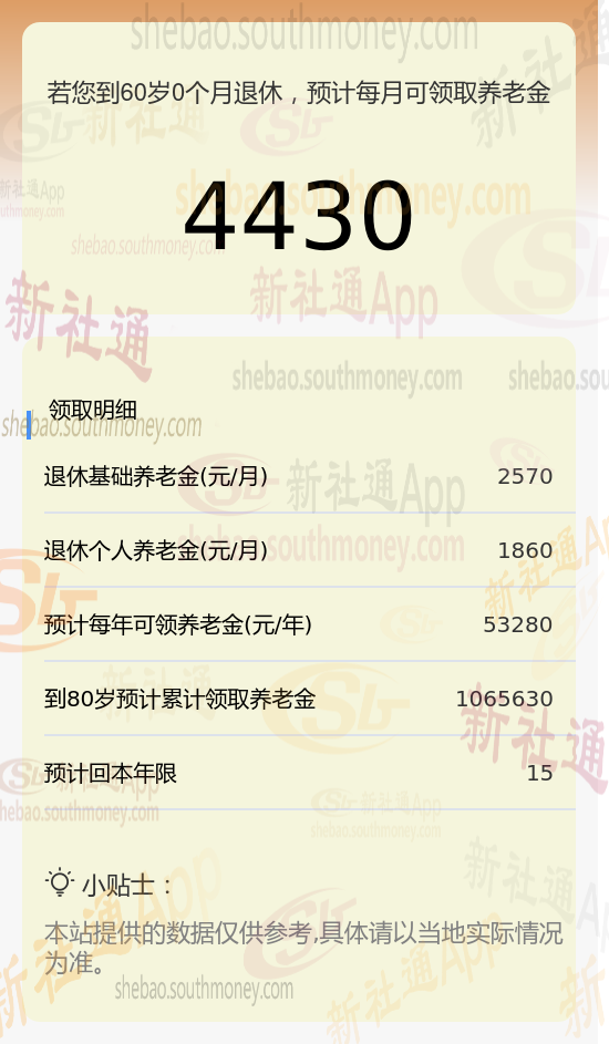朱某,拥有长达35年的养老保险缴纳年限,其缴费档次一直维持在较高的110%水平。基于这些详细信息,我们使用了新社通app养老金计算器,并参考了当前的养老保险法规,对他未来的养老金进行了如下估算: