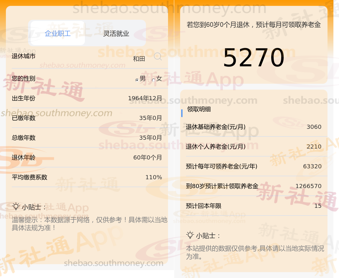 退休城市:和田,性别:男,出生年份:1964,总缴年数35年,缴费档次:110%,新社通app养老金计算器所得: