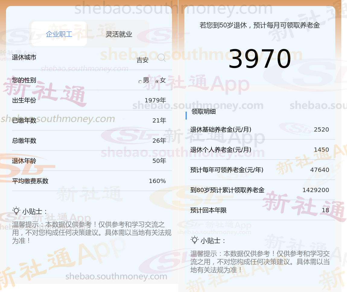 通过新社通APP-养老金计算所得:假设都在吉安退休、出生年份、退休年龄和缴费系数均保持不变的情况下,若个人的社保缴费年限累计达到26年,那么其相关计算方式如下: