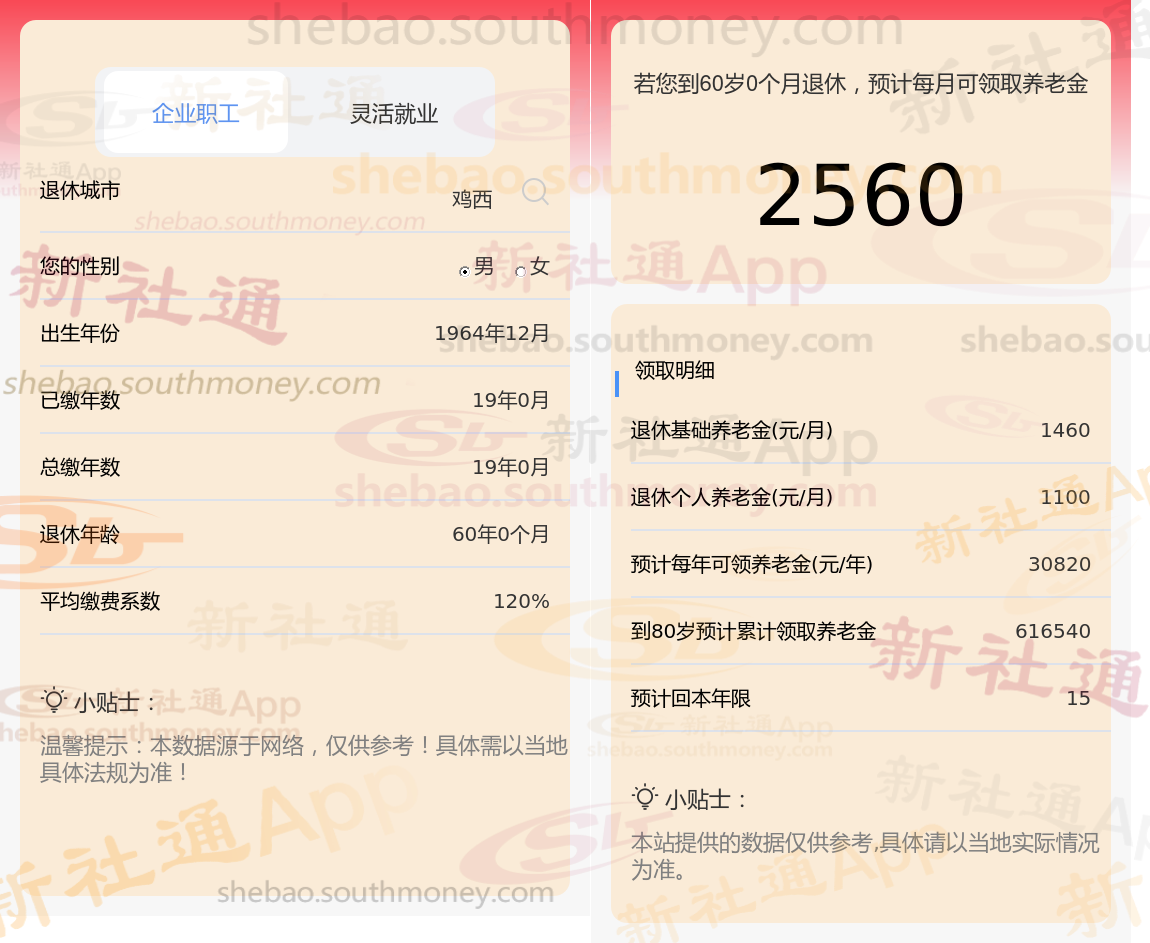 退休城市:鸡西,性别:男,出生年份:1964,总缴年数19年,缴费档次:120%,新社通app养老金计算器所得: