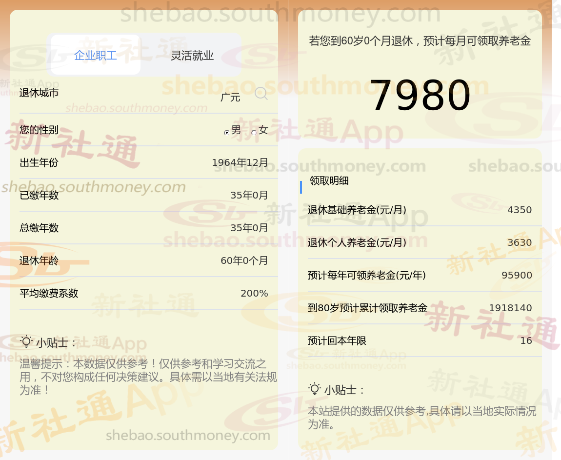 退休城市:广元,性别:男,出生年份:1964,总缴年数35年,缴费档次:200%,新社通app养老金计算器所得: