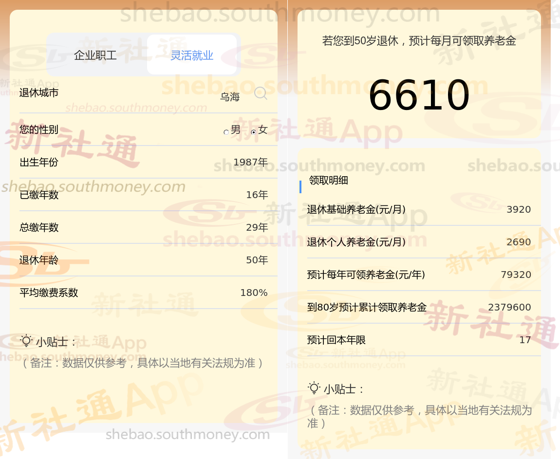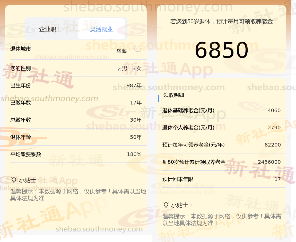 通过新社通APP-养老金计算所得:退休城市、出生年份、退休年龄、缴费系数都相同的情况下,社保缴费年限累计30年时,计算如下: