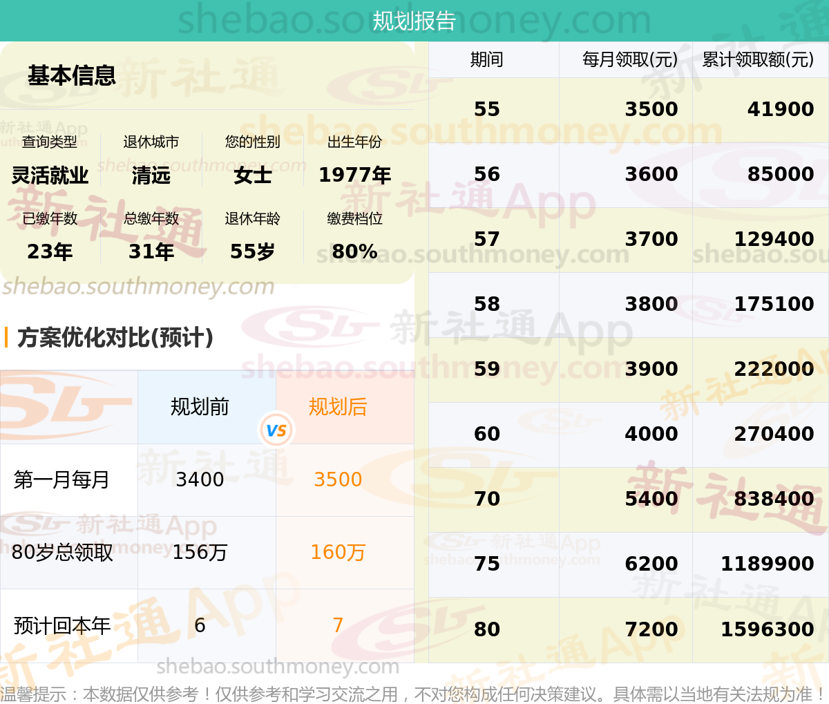 规划前:参保城市:广东清远,性别:女士,出生年月:1977,已缴年限:23年,总缴年数:31年,退休年龄:55岁,缴费档位:80%。