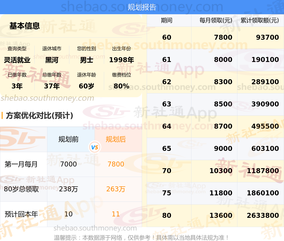 规划前:参保城市:黑龙江黑河,性别:男士,出生年月:1998,已缴年限:3年,总缴年数:37年,退休年龄:60岁,缴费档位:80%。