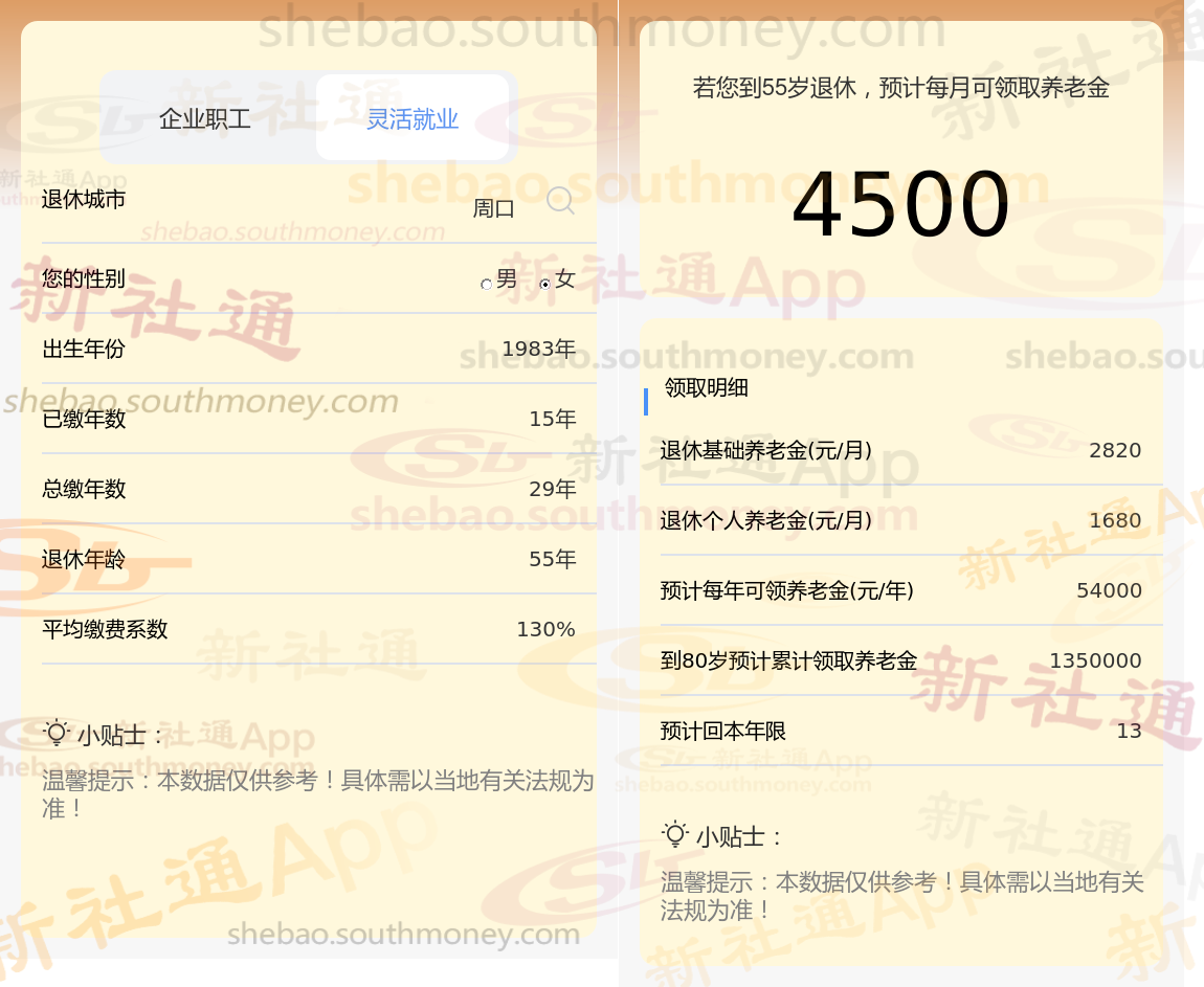 通过新社通APP-养老金计算所得:在保持退休城市、出生年份、退休年龄以及缴费系数这些条件不变的前提下,当个人的社保缴费年限累积达到29年时,其相关计算方式如下: