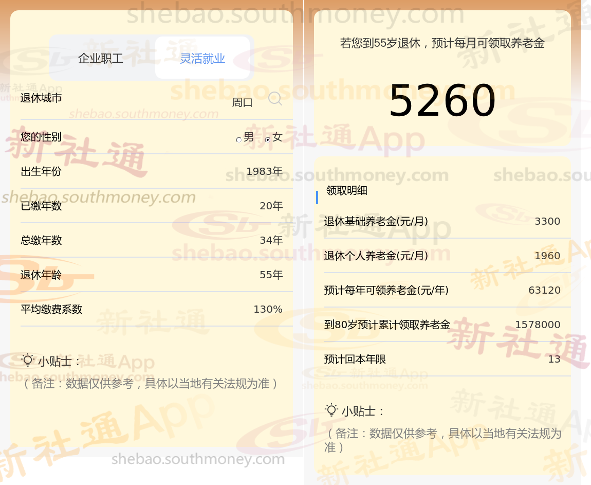 通过新社通APP-养老金计算所得:在保持退休城市、出生年份、退休年龄以及缴费系数这些条件不变的前提下,当个人的社保缴费年限累积达到34年时,其相关计算方式如下: