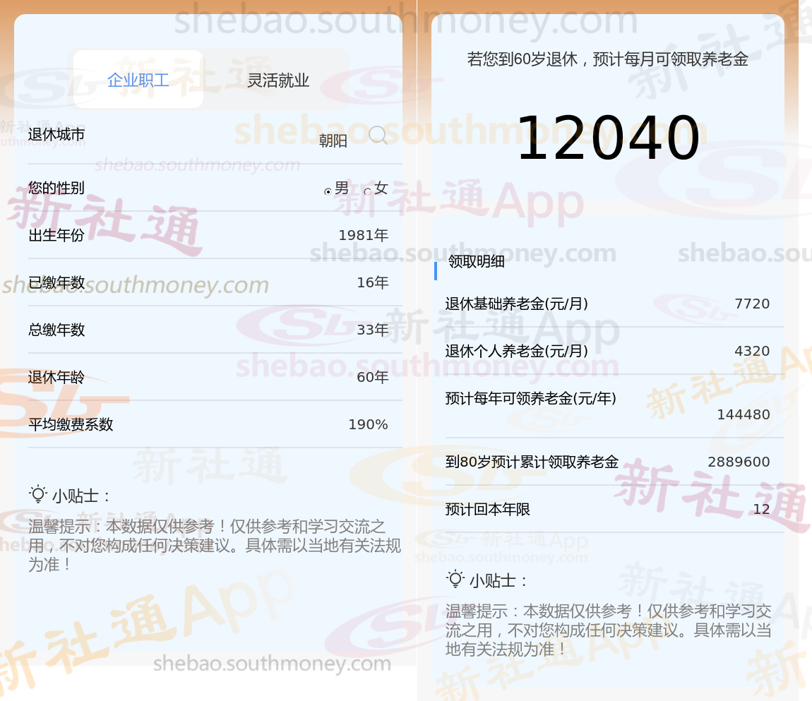 通过新社通APP-养老金计算所得:在保持退休城市、出生年份、退休年龄以及缴费系数这些条件不变的前提下,当个人的社保缴费年限累积达到33年时,其相关计算方式如下: