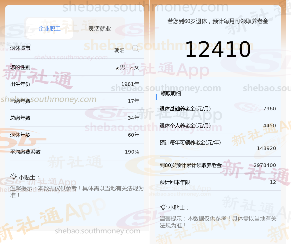 通过新社通APP-养老金计算所得:在保持退休城市、出生年份、退休年龄以及缴费系数这些条件不变的前提下,当个人的社保缴费年限累积达到34年时,其相关计算方式如下: