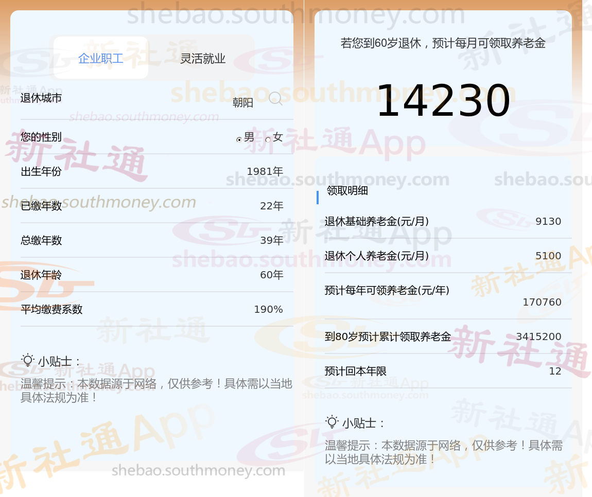 通过新社通APP-养老金计算所得:在保持退休城市、出生年份、退休年龄以及缴费系数这些条件不变的前提下,当个人的社保缴费年限累积达到39年时,其相关计算方式如下: