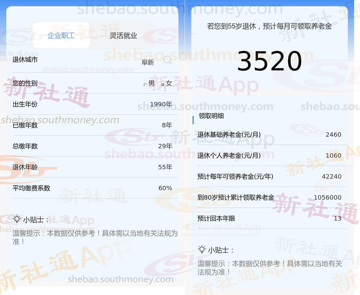 通过新社通APP-养老金计算所得:在保持退休城市、出生年份、退休年龄以及缴费系数这些条件不变的前提下,当个人的社保缴费年限累积达到29年时,其相关计算方式如下: