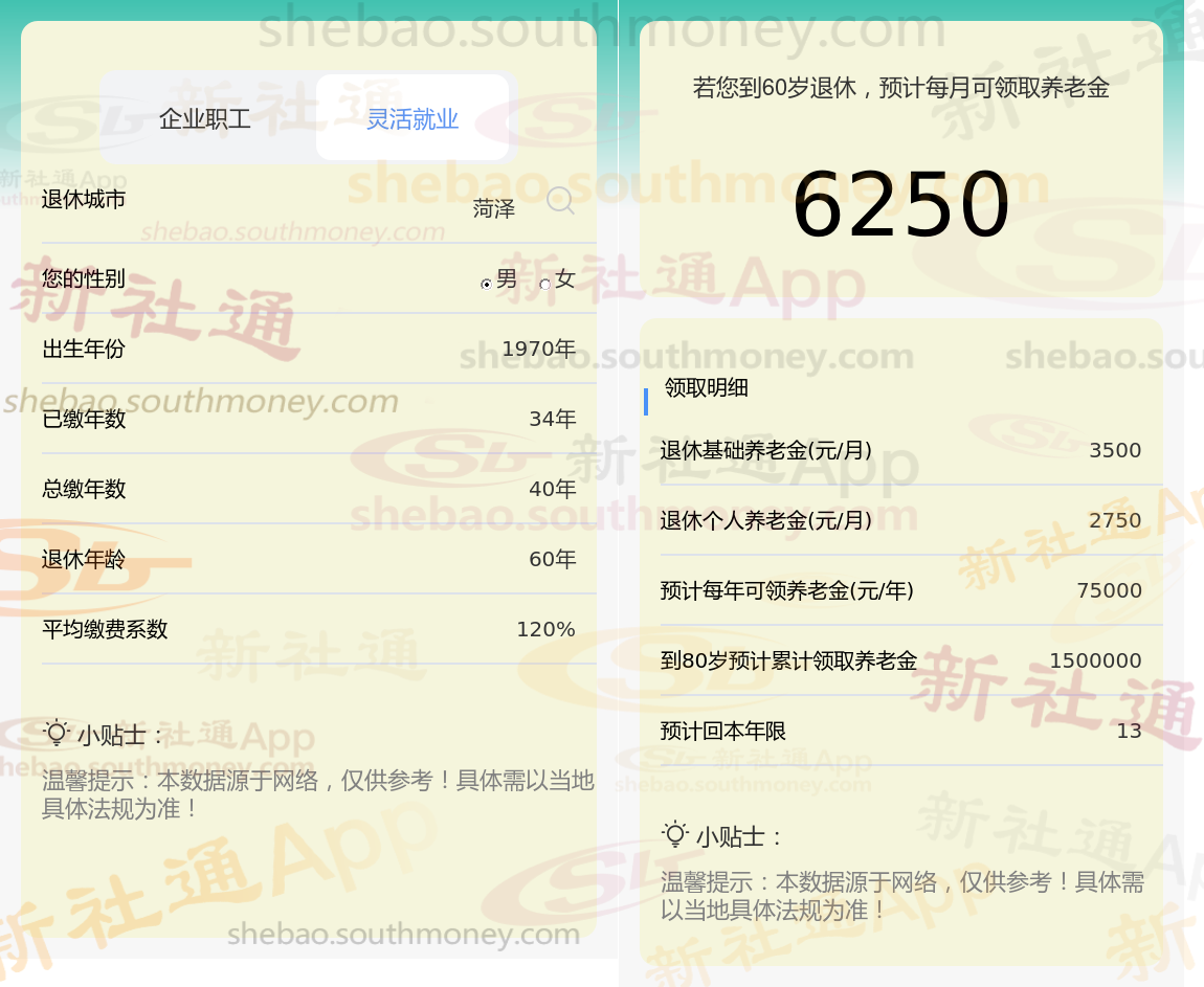 通过新社通APP-养老金计算所得:假设都在菏泽退休、出生年份、退休年龄和缴费系数均保持不变的情况下,若个人的社保缴费年限累计达到40年,那么其相关计算方式如下: