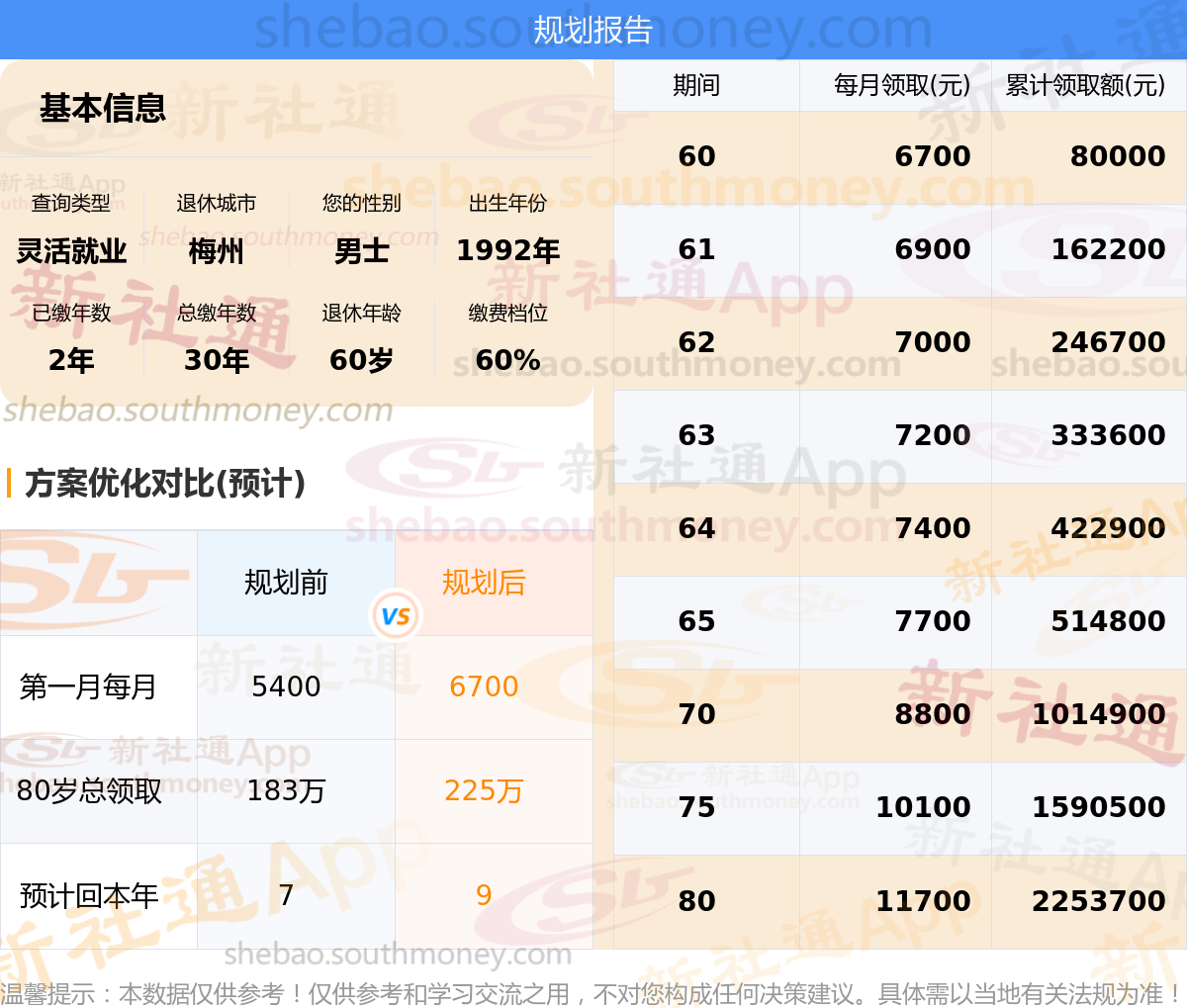 规划前:60岁第一个月约领5400元,新社通APP-养老金规划后:60岁第一个月约领6700元