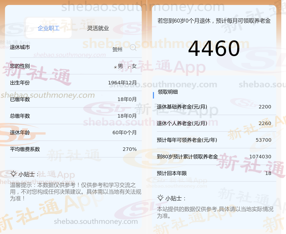 朱某,拥有长达18年的养老保险缴纳年限,其缴费档次一直维持在较高的270%水平。基于这些详细信息,我们使用了新社通app养老金计算器,并参考了当前的养老保险法规,对他未来的养老金进行了如下估算: