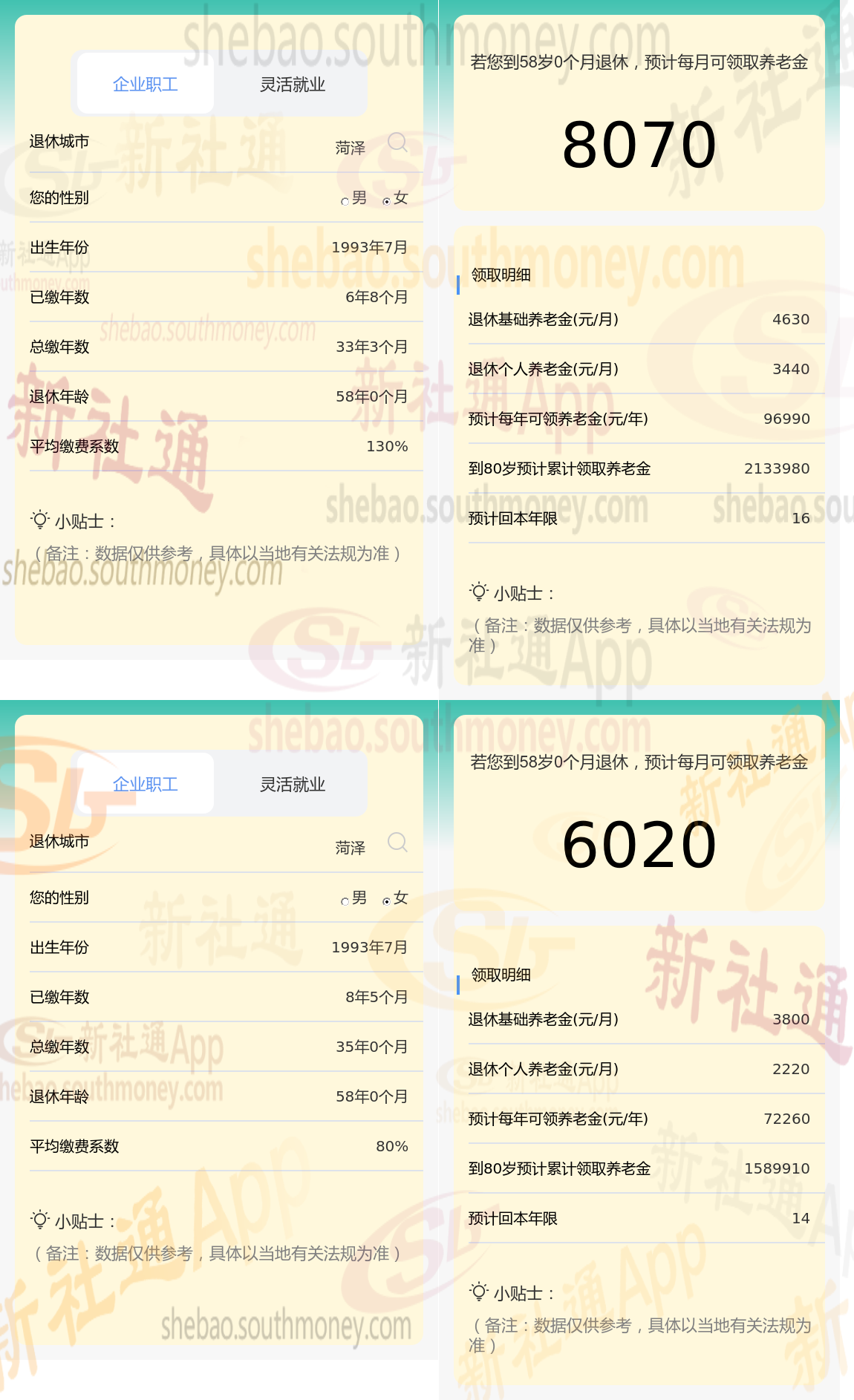 以菏泽为具体案例(在此社保网-APP暂不将过渡养老金纳入考量):单位在菏泽退休,其社保缴费的累计年数为33年,于58周岁时正式步入退休生活,且一直以来,他都按照130%的缴费档位进行社保缴纳。