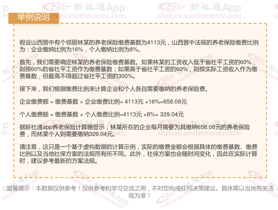 据新社通app显示,山西晋中职工养老缴费基数2023-2024年最新标准是多少,山西晋中养老保险基数明细如下: