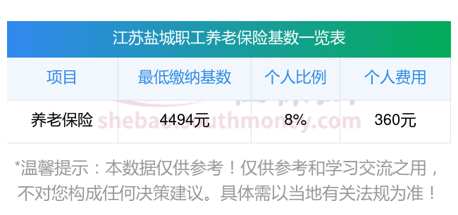 据新社通app获悉,职工养老保险是我国基本养老保险体系的重要组成部分,它采取的是单位与个人共同缴费的机制。一般而言,个人的缴费比例为8%。在常规情况下,单位所缴纳的养老保险费用会直接汇入养老保险统筹基金账户中,用于整个养老保险体系的资金积累和运作。那么,江苏盐城养老保险2023-2024年缴费标准是多少?下面随新社通app小编一起来看看详情吧。