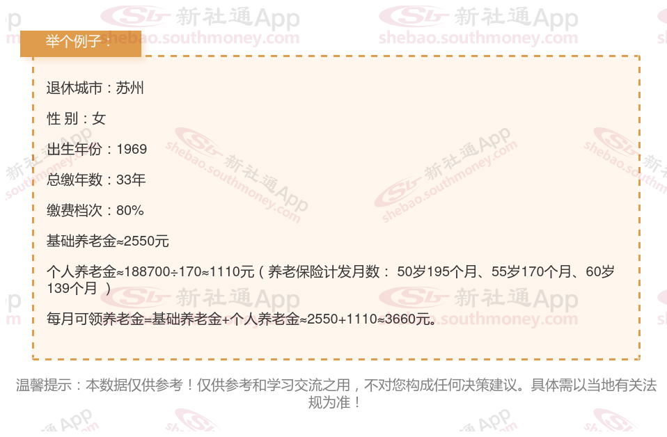 退休城市:苏州,性别:女,出生年份:1969,总缴年数33年,缴费档次:80%,新社通app养老金计算器所得:
