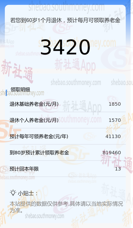 新社通app养老金计算器算出基本养老保险一个月领多少钱?