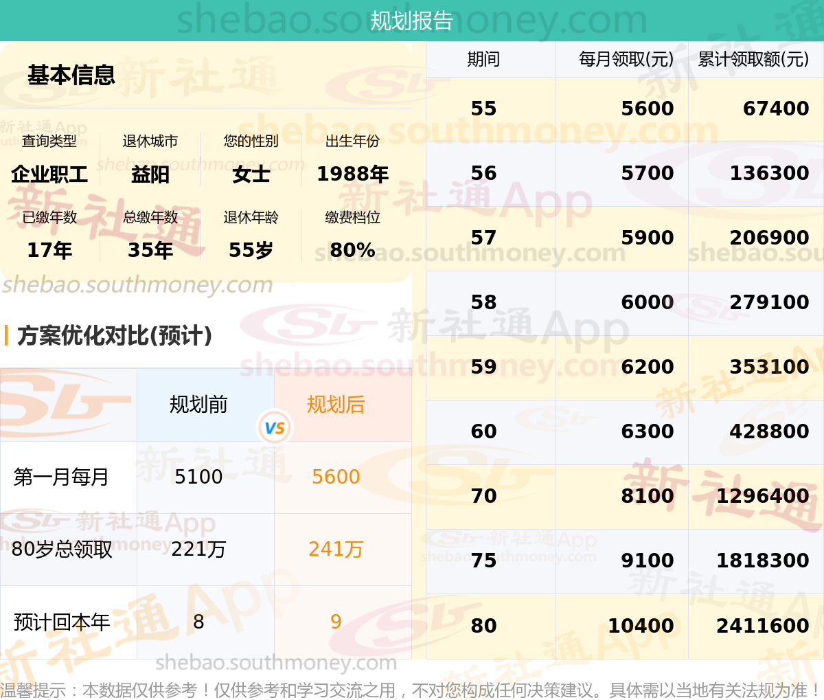 规划前:55岁第一个月约领5100元,新社通APP-养老金规划后:55岁第一个月约领5600元