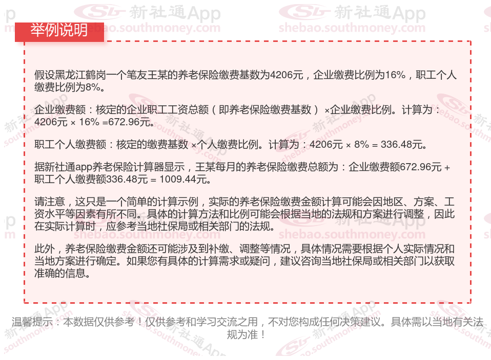 假设黑龙江鹤岗的养老保险缴费基数为4206元,个人按照8%的比例缴纳养老保险费用,企业按照16%的比例缴纳。则该职工的养老保险缴费计算如下: