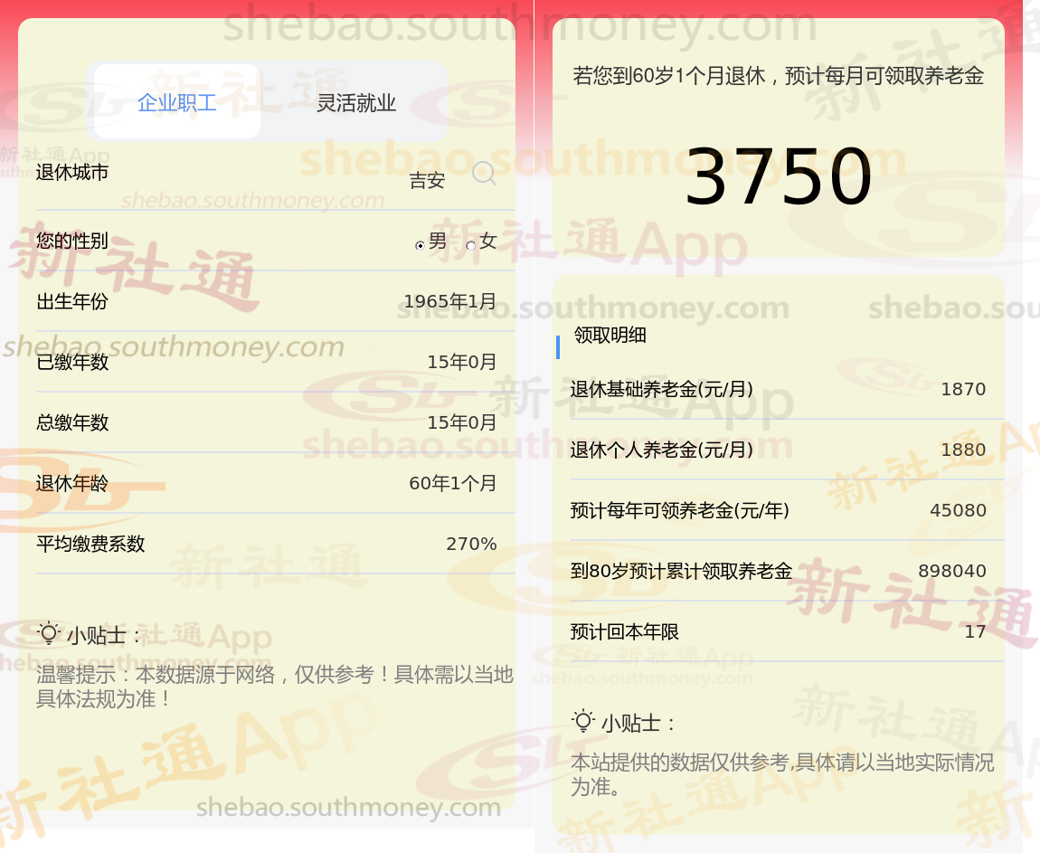 退休城市:吉安,性别:男,出生年份:1965,总缴年数15年,缴费档次:270%,新社通app养老金计算器所得: